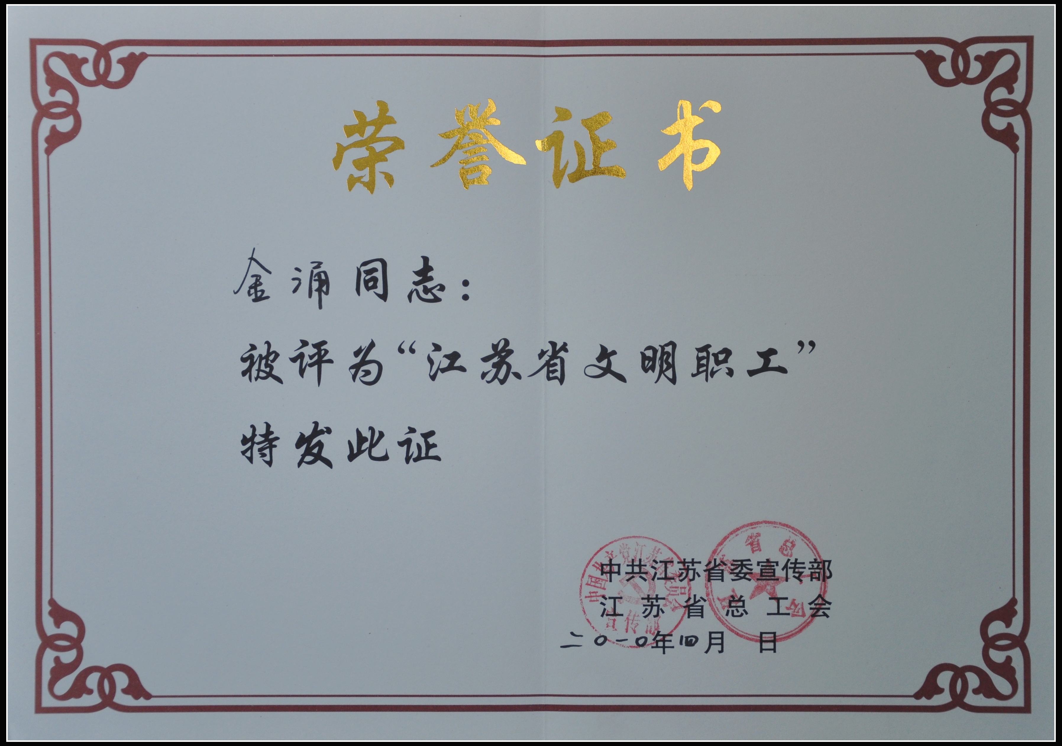 金涌榮獲“江蘇省文明職工”稱(chēng)號(hào)