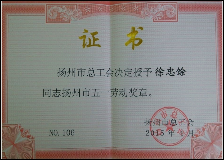 我司職工徐忠馀榮獲揚州市五一勞動獎?wù)?/div>