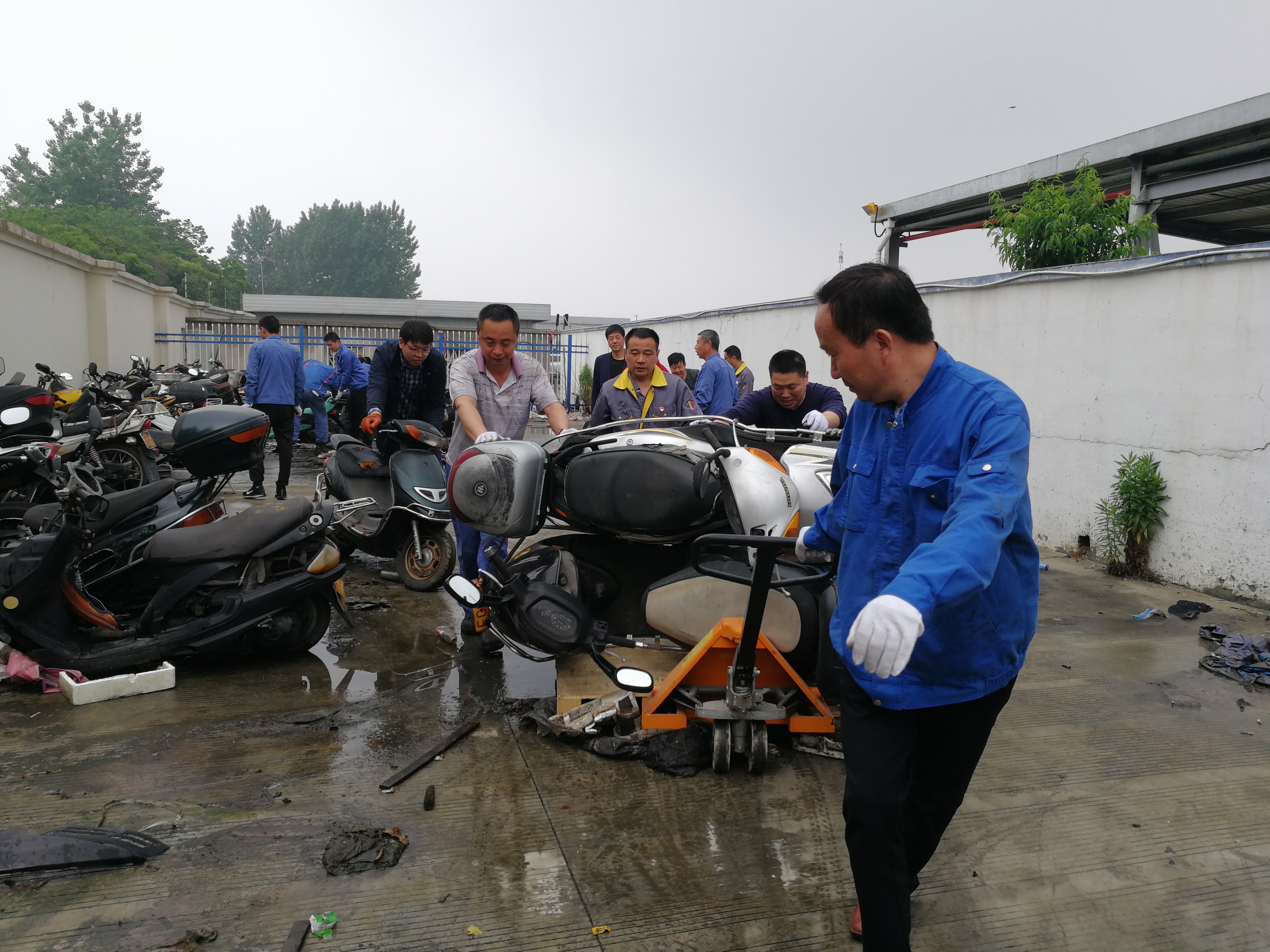8時(shí)15分搬運(yùn)工作正式開始,針對(duì)輪軸銹蝕、車輪變形、車輪遺失、車輪鎖死等不同情況的扣押車輛,大家使用車輪托架、電動(dòng)三輪、托盤叉車等輔助搬運(yùn)工具,共同協(xié)作,聽從指揮,一步一步移至指定區(qū)域。經(jīng)過兩個(gè)半小時(shí)的高效協(xié)作,大家克服場地臟亂和天氣的悶熱,將靠近天燃?xì)饧託庹疽粋?cè)的車輛全部清理完畢,扣押場地車輛在指定停放區(qū)域擺放整齊,消除了安全隱患。